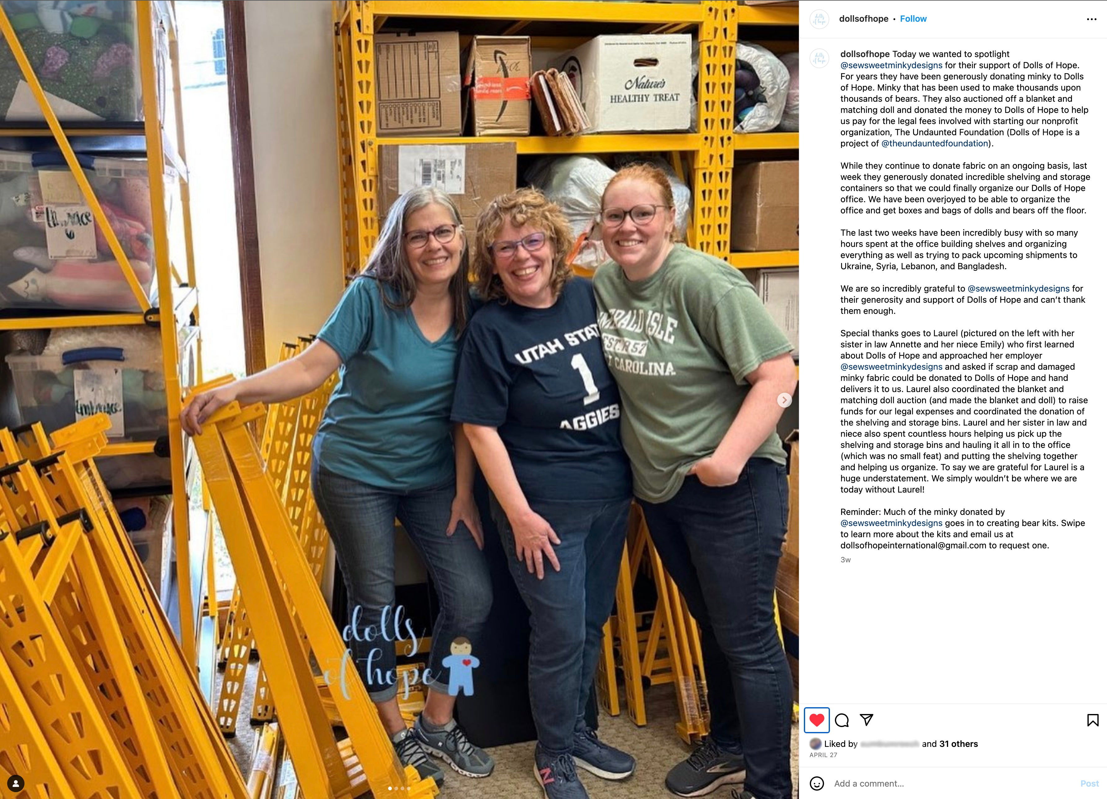 Dolls of Hope is a non profit organization that focuses on creating and giving bears and dolls to children in crisis and refugee situations. Each doll is made with love and donated world wide. To highlight a few achievements, Dolls of Hope along with their many volunteers and partners have been able to create and send 1597 bears and dolls to Poland for Ukrainian refugees as well as deliver 1804 bears and 197 dolls to eyes4zimbabwe.